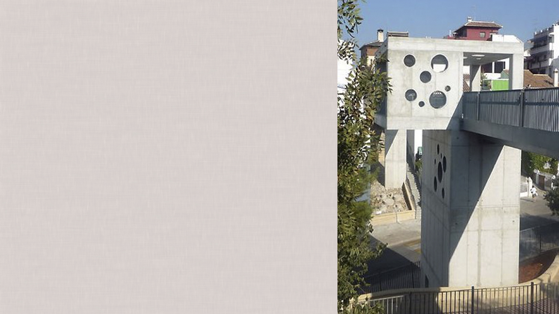 El proyecto plantea realizar una pasarela con carácter ligero en los tableros, mientras que, en contraste con éstos, el pilar principal presenta un carácter masivo y constituye una pequeña plaza elevada que nos permita contemplar las vistas de la Vega granadina. En definitiva, un mirador en altura. Se busca que el conjunto se integre en el lugar, adecuándose al viario y respetando al máximo la vegetación del Parque de la Nava.